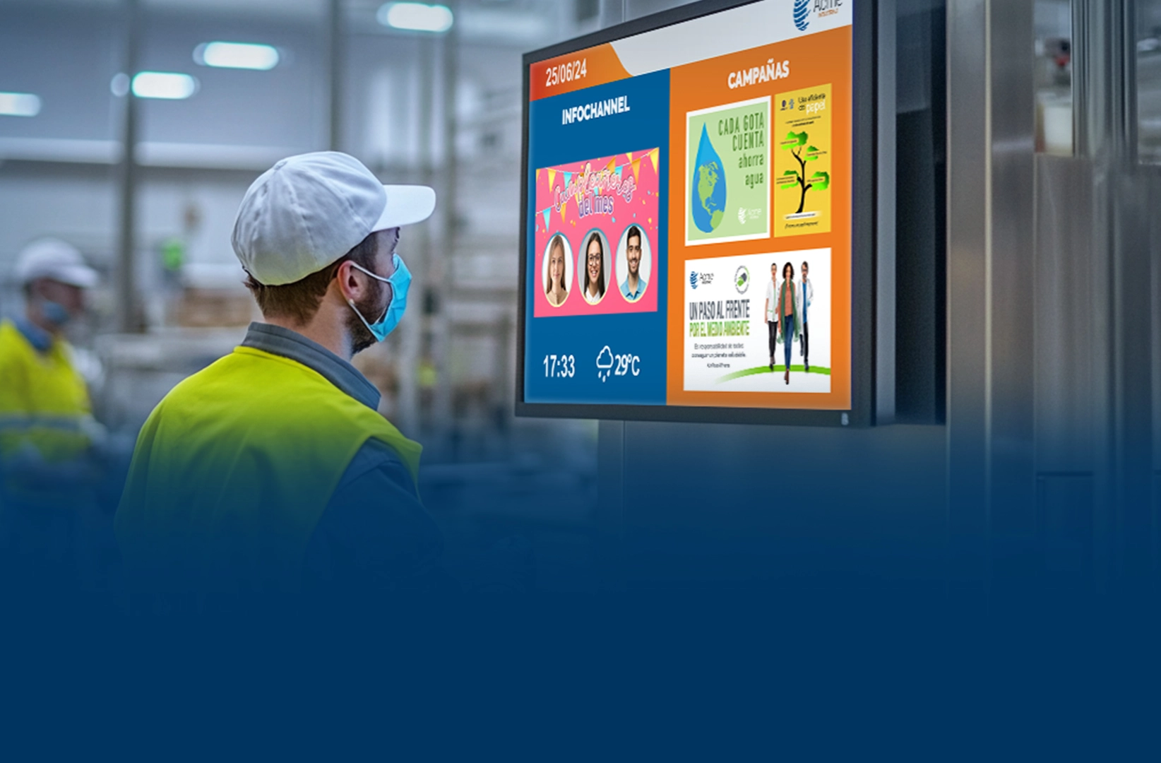 Mejora la comunicación interna de tu empresa a través de pantallas digitales inteligentes, asegurando que los mensajes clave lleguen de forma clara, visual y efectiva a todo el personal en tiempo real, ideal para fortalecer el compromiso.