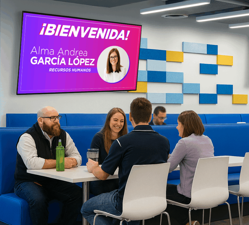 La digital signage es el uso de pantallas digitales para transmitir contenido visual como cumpleaños, aniversarios, reconocimientos, comunicados internos, eventos, métricas. A diferencia de los anuncios tradicionales impresos, las pantallas digitales permiten actualizar el contenido en tiempo real, adaptarse al contexto y captar la atención de forma inmediata.
