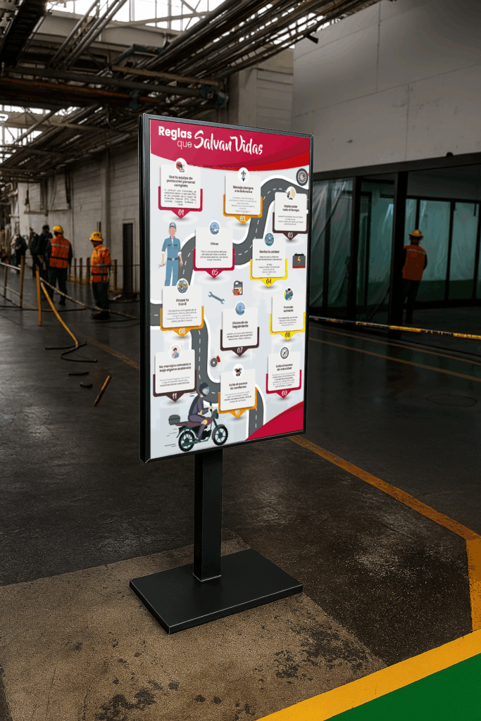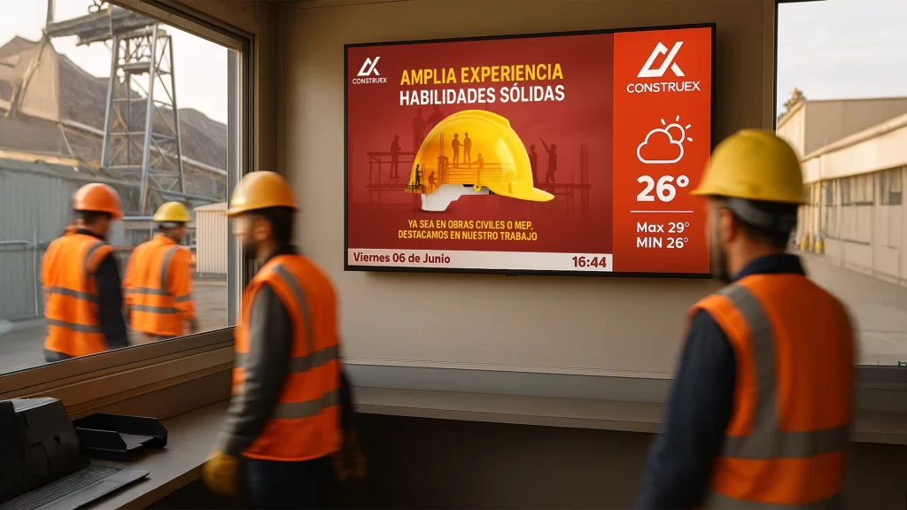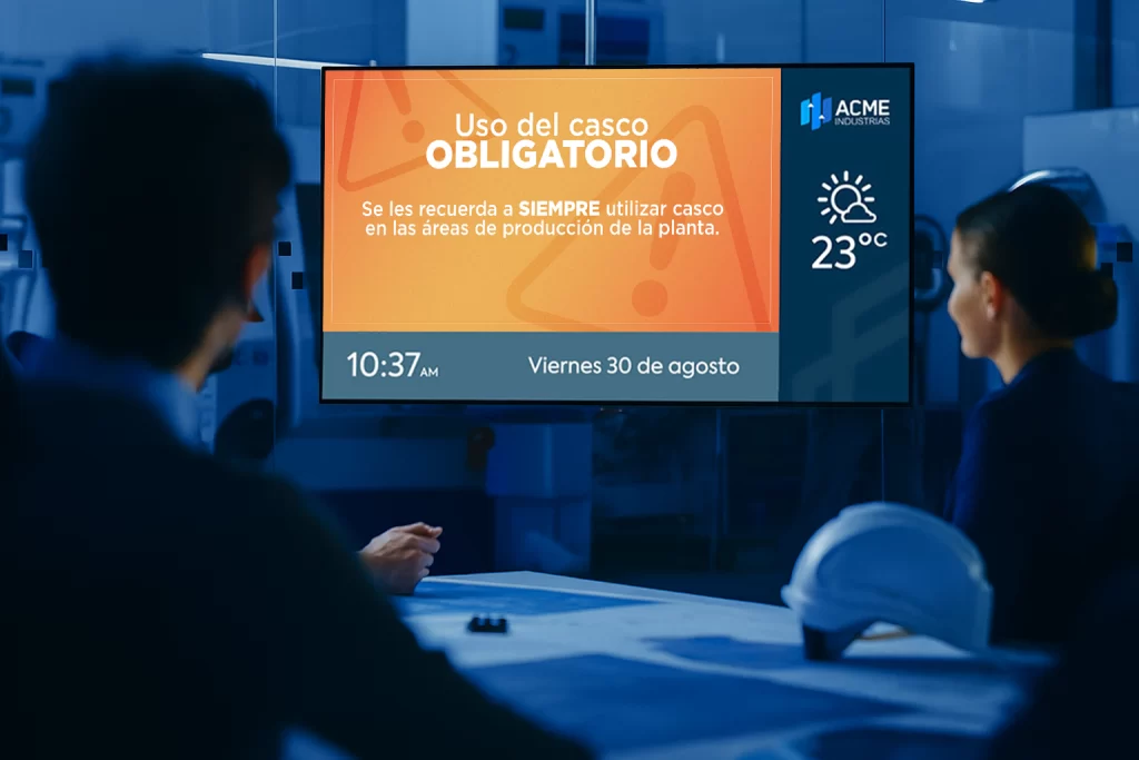 Pantallas ubicadas estratégicamente para mostrar mensajes clave, cumpleaños, aniversarios, avisos importantes, KPIs, alertas de seguridad, o campañas internas. Todo se gestiona de forma remota y en tiempo real.